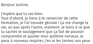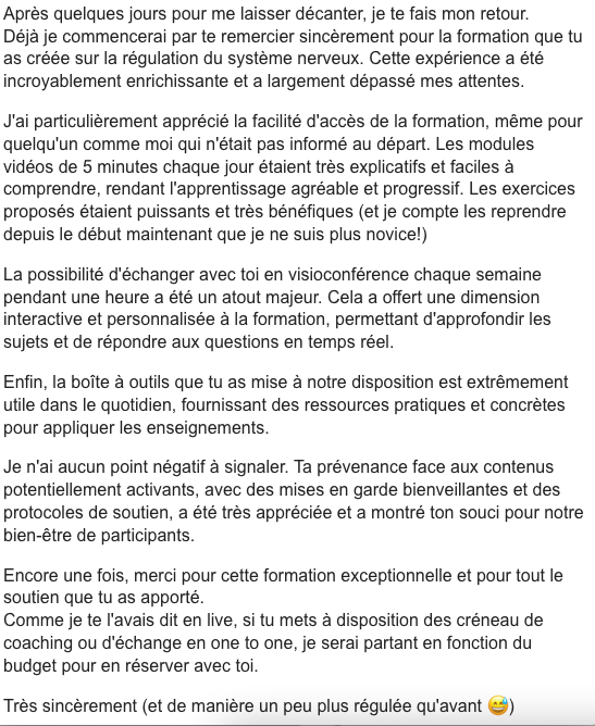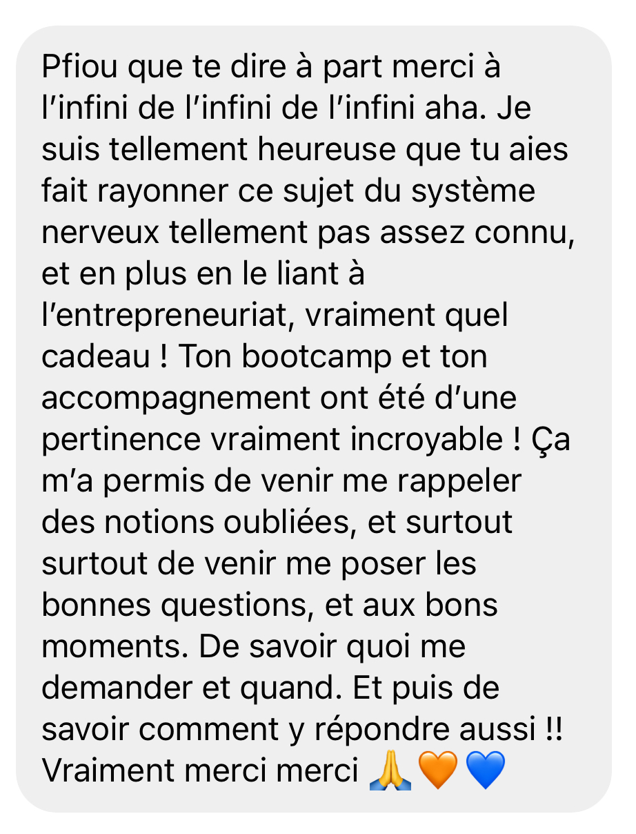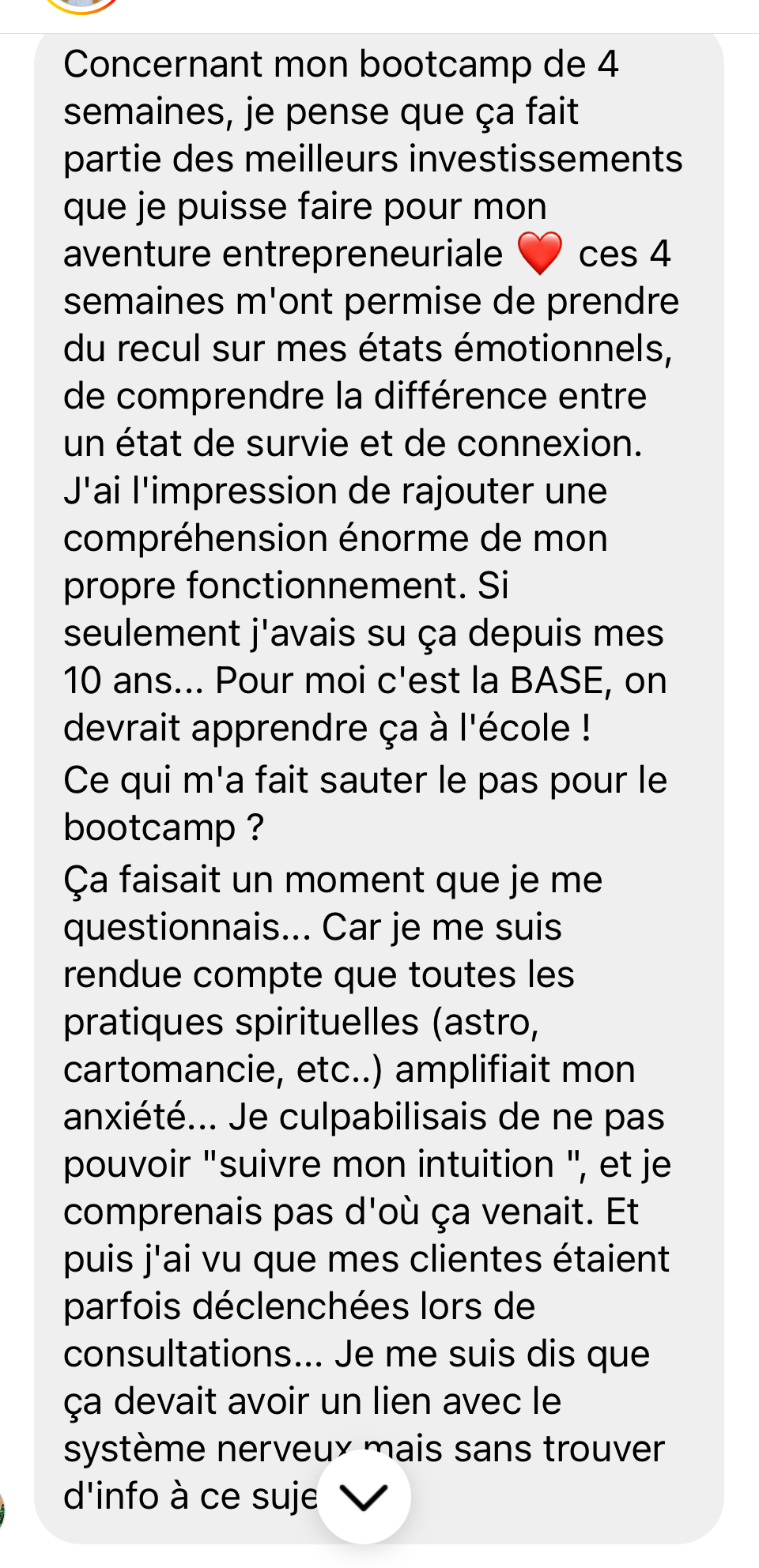 J'ai été tarologue, astrologue, coach business, mais il me manquait la fondation, le préalable : le système nerveux ! Parce que quand tu es en mode survie, c'est impossible de faire du développement personnel. Ou alors ça té fait du bien sur le moment et quelques instants après c'est ta biologie qui reprend le volant.