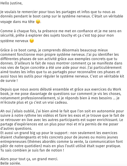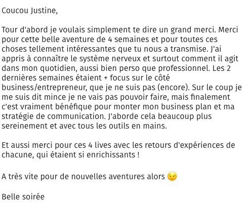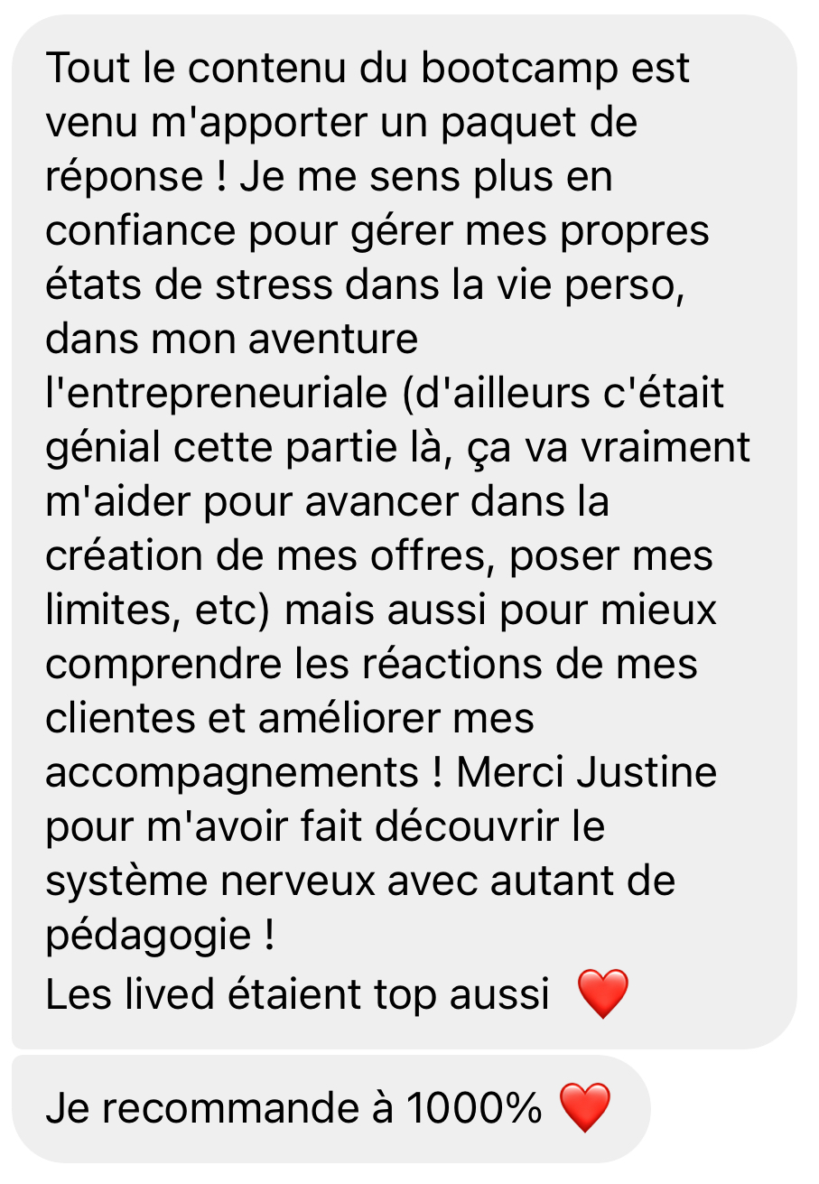 Je suis Justine, entrepreneure depuis 3 ans. Ca fait des années que je coach des entrepreneurs et aujourd'hui j'ajoute la facette du système nerveux.
